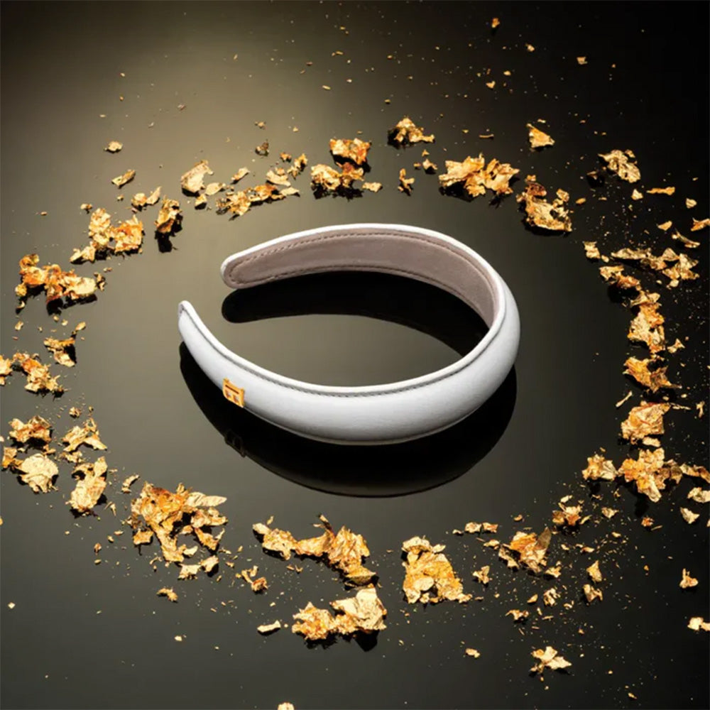 Genuine napa leather headband with a puffed silhouette. Embellished with 18K gold plated logo element. Adds the perfect amount of hight to each hairstyle. With nubuck lining on the inside to give extra grip onto the hair.