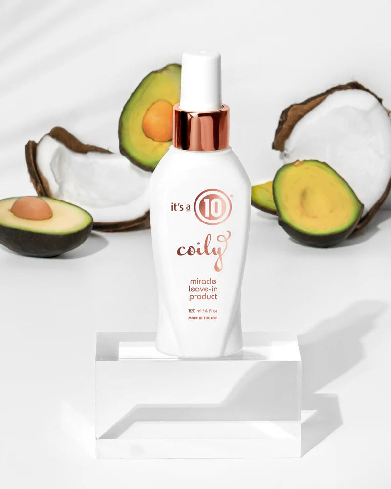 Nothing is as alluring as shiny, smooth, frizz -free hair regardless of how it’s styled. It’s a 10 Miracle Coily Leave -In gives you the freedom to explore dozens of different looks all with the same flawless finish you’ve come to expect from It’s a 10. Stunning braids without flyaways, beachy waves that look soft and conditioned, defined springy curls, sleek straightened tresses – it’s all possible with just one product. It works by penetrating hair with deep moisturizers to soften and seal strands, while also imparting a bit of weightless styling control that takes the place of gels or hairsprays. Welcome to go - everywhere, do anything hair that gets more luscious with every use.